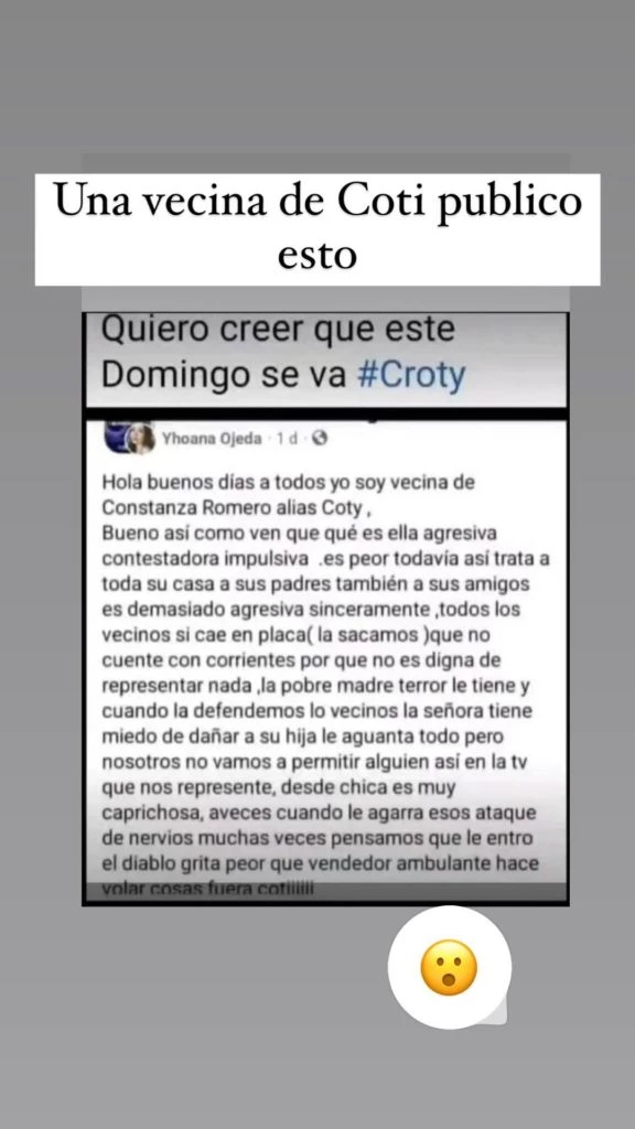 "Quiero creer que este domingo se va Coti. Hola, buenos días a todos, yo soy vecina de Constanza Romero alias Coti...", arrancó el escrito de la vecina, que Mariano De la Canal replicó en su cuenta de Instagram, en contra de Coti.