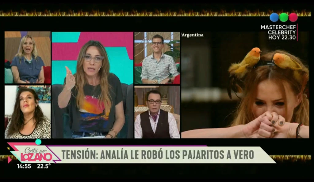 Pidiendo que bajaran la música en el estudio, la conductora hizo un picante anuncio. "Tengo una denuncia para hacer: esos pajaritos son míos", dijo Lozano muy seria. "Ella vino a mi casa en la navidad del año pasado y yo los tenía puestos en el baño", relató. Al parecer Franchín le habría pedido prestado el elemento decorativo y ella accedió. "Yo le dije 'sí, te presto el pajarito'", continuó para las risas de todo el piso.