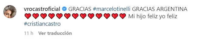 "Gracias, Marcelo Tinelli. Gracias, Argentina. Mi hijo feliz, yo feliz”, posteó Verónica en su cuenta de Instagram, emocionada con la performance del artista tan querido en nuestro país.
