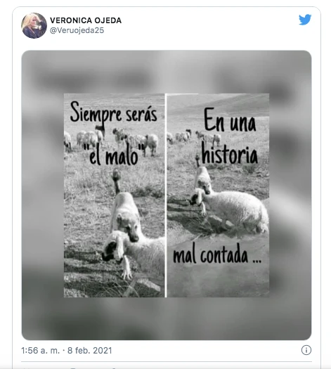 La exnovia de Maradona escribió: "Siempre serás el malo en una historia mal contada". Lo que acompañó por dos fotos, una que hace un zoom en un perro que toma del cogote a una oveja, y la otra que refleja que en realidad el canino la estaba ayudando a salir de un charco de agua.