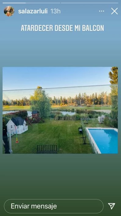 Así, escribió: “Atardecer desde mi balcón”. Además de tomar dimensión del panorama, esta foto posibilitó divisar en toda su dimensión el jardín de Luli Pop. Ese terreno interminable, con un césped cuidado y una piscina gigantesca, ideal para retozar al sol y refrescarse en verano.