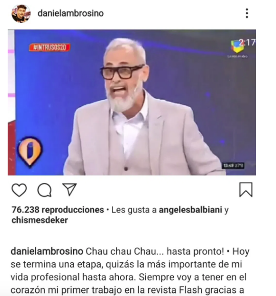 Y decidió, charla con Jorge Rial, sus compañeros y las autoridades del canal de por medio, entre ellas Liliana Parodi, apostar a nuevos rumbos laborales. Emocionado por dejar una etapa de veinte años, de cubrir largas temporadas en Mar del Plata y entrevistar a todos los famosos habidos y por haber, Ambrosino posteó un sentido mensaje en su cuenta de Instagram.