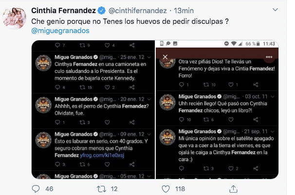 Cinthia acompañó su posteo con una serie de tuits de Migue tan antiguos como violentos, en los que parece estar curiosamente ensañado u obsesionado con ella, con su figura o con su personalidad. Algo muy parecido a lo que sucedió con el rugbier que sin demasiada explicación le dedicó siete u ocho mensajes amenazantes a Claribel Medina.