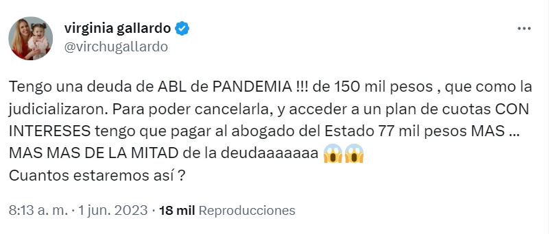 “Tengo una deuda de ABL de pandemia de 150 mil pesos que la judicializaron”, empezó la panelista en Twitter. Luego, explicó: “Para poder cancelarla, y acceder a un plan de cuotas con intereses, tengo que pagar al abogado del Estado 77 mil pesos más…”.
