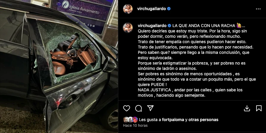 Virginia Gallardo volcó toda su angustia en Instagram tras sufrir un violento robo en su auto. La artista subió una imagen donde se ve como quedó su móvil tras ser azotado por los ladrones. "Ser pobres no es sinónimo de ladrón o asesinos”.