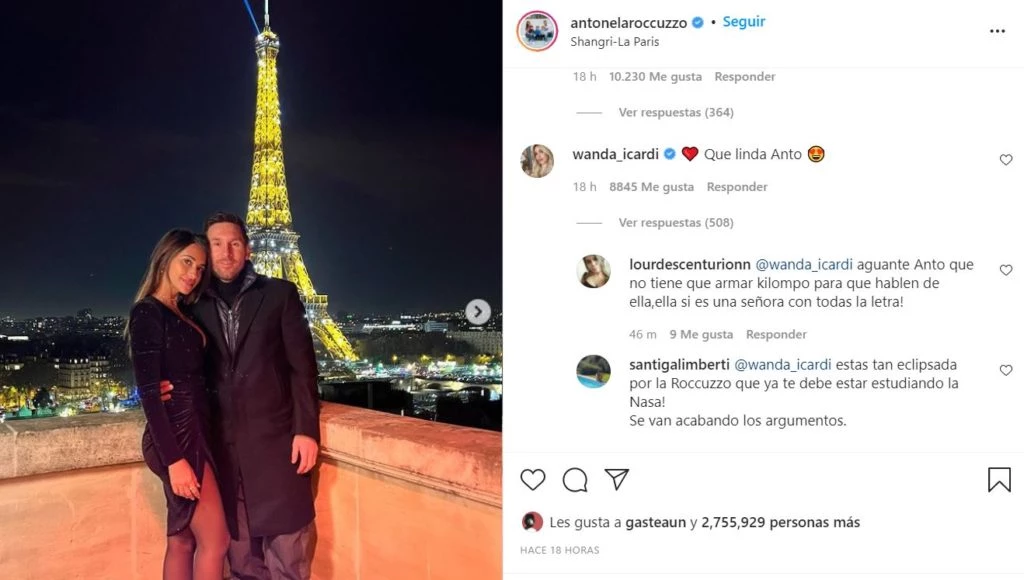 “Te amo tanto, mi amor”, había escrito Rocuzzo en un posteo en el que subió dos románticas postales junto a Messi, con la Torre Eiffel iluminadísima, de fondo. ¿Y qué hizo Wandi? Expresó, junto a un corazón y una carita enamorada: “Qué linda, Anto”.