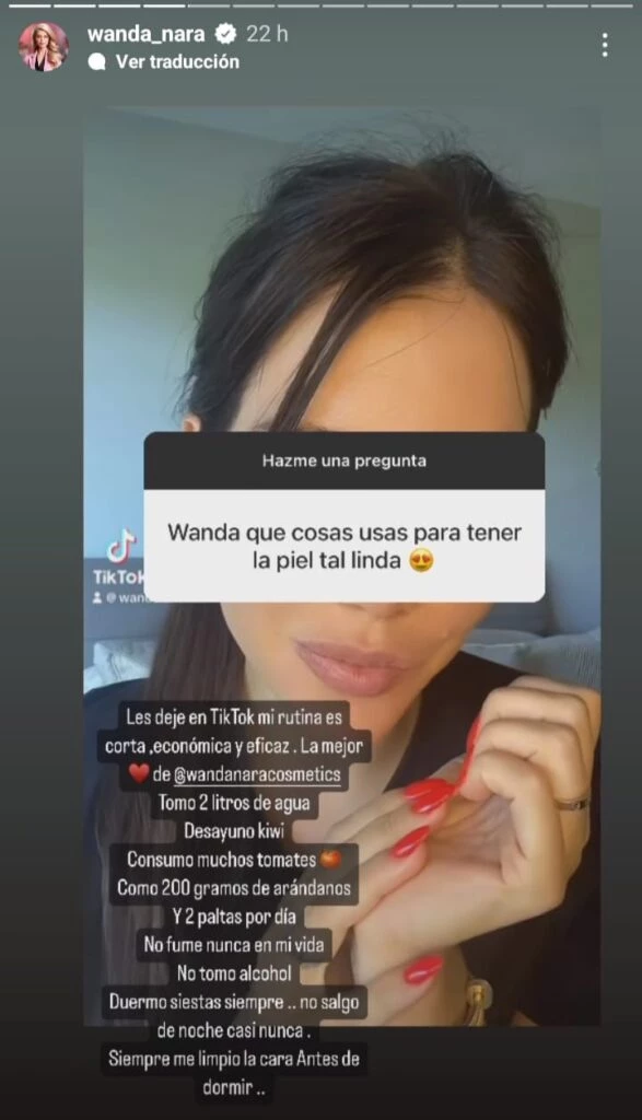 "Wanda qué cosas usás para tener la piel tan linda", le escribió un internauta en la cajita de preguntas y respuestas. A lo que la mediática eligió contestar en su historia utilizando una foto de su rostro y escribió: “Mi rutina es corta, económica y eficaz”.