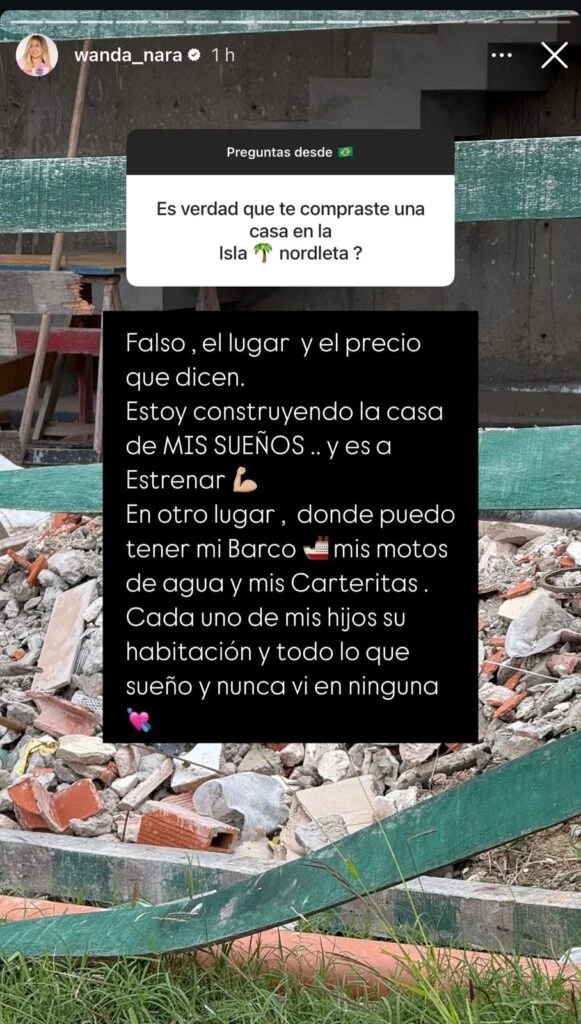Sobre la foto de lo que parece ser una montaña de escombros, entre ladrillos y cercos de construcción, la ex de Mauro Icardi escribió: “Es falso que me compré una casa en Nordelta. Falso el lugar y el precio que dicen. Estoy construyendo la casa de MIS SUEÑOS…”.