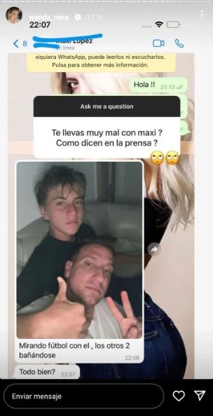 “¿Te llevás muy mal con Maxi, como dicen en la prensa?”, quiso saber una persona, y ella, como prueba, compartió una captura de WhatsApp en la que se ve al ex jugador junto a su hijo mayor, muy buena onda.