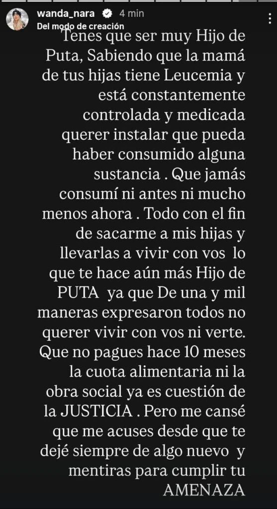Wanda dijo que “jamás consumió” y “mucho menos ahora”, teniendo en cuenta su enfermedad. Y la rubia fue a más: “Todo con el fin de sacarme a mis hijas y llevarlas a vivir con vos, lo que te hace aún más hijo de puta ya que de una y mil maneras expresaron todos no querer vivir con vos ni verte”.
