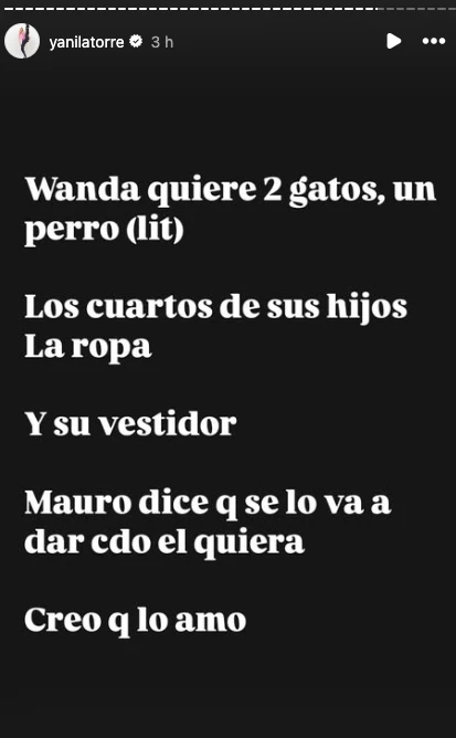 “Se viene una nueva guerra. La mudanza. Wanda quiere 2 gatos, un perro (literal). Los cuartos de sus hijos, la ropa, y su vestidor. Mauro dice que se lo va a dar cuando él quiera”, comenzó diciendo Latorre desde su cuenta de Instagram.