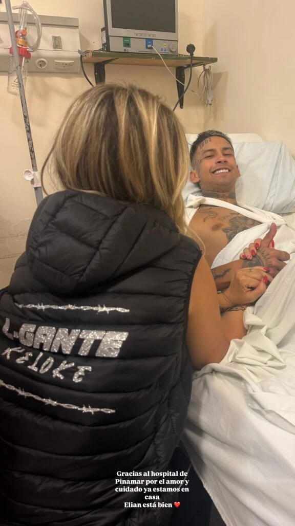 “Gracias al hospital de Pinamar por el amor y por el cuidado. Ya estamos en casa. Elián está bien”, expresó Wanda con un corazoncito rojo en una de sus publicaciones donde se ve a su novio, quien habría sufrido fractura de clavícula.