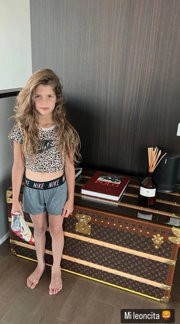 "Me llegó el baúl , ¡miren lo que es!", anuncia la esposa del jugador del PSG, al presumir del original arcón Louis Vuitton que ubicó como mesita en un rincón del inmenso living dominado por el juego de sillones y una mesa eterna.
