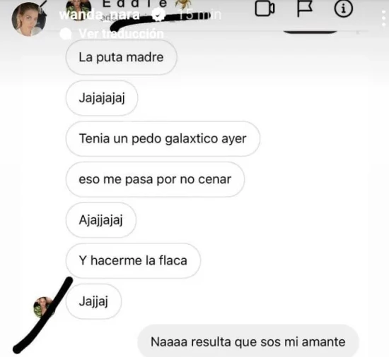 Y ahora Wanda publicó, en su cuenta de Instagram, un divertida que tuvo con Eddie, tras el revuelo mediático que se armó. "La put... madre, tenía un ped... galáctico ayer... Eso me pasa por no cenar y hacerme la flaca", arranca el fragmento de la conversación que expuso Nara.