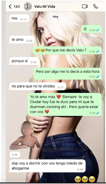 Así se pudo leer una serie de mensajes estremecedores: "Ma te amo". Ante lo cual, Wanda le retrucó: “¿Por qué me decís Valu?". Lo que recibió como respuesta “por que si”, por eso la mediática se angustió: "Pero por algo me lo decís a esta hora". Lo que recibió de respuesta: "Para que no te olvides”.