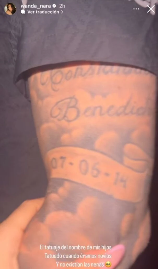 En tanto pretendía tomar el ángulo justo para que se lea Valentino, Benedicto y Constantino en la piel de su marido, Wanda escribió: “El tatuaje del nombre de mis hijos. Tatuado cuando eramos novios y no existían las nenas”. Cabe recordar que la relación entre ellos comenzó cuando la mediática estaba casada con Maxi López.