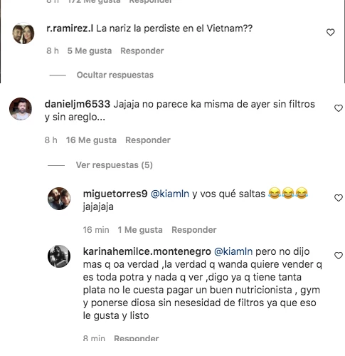 “¿La nariz la perdiste en Vietnam?”, escribió un follower. Otro usuario se sumó con una crítica y redactó: “No parece la misma de ayer sin filtros y sin arreglo…”. De ese modo se acumularon mensajes de ese tenor, un debate de añares sobre el exceso de retoques que suele acudir Wanda.