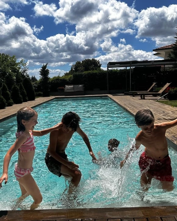“Mi casa en Estambul”, escribió, junto a varias fotos del jardín, con sus hijos como su marido, divirtiéndose en el agua en diferentes postales.