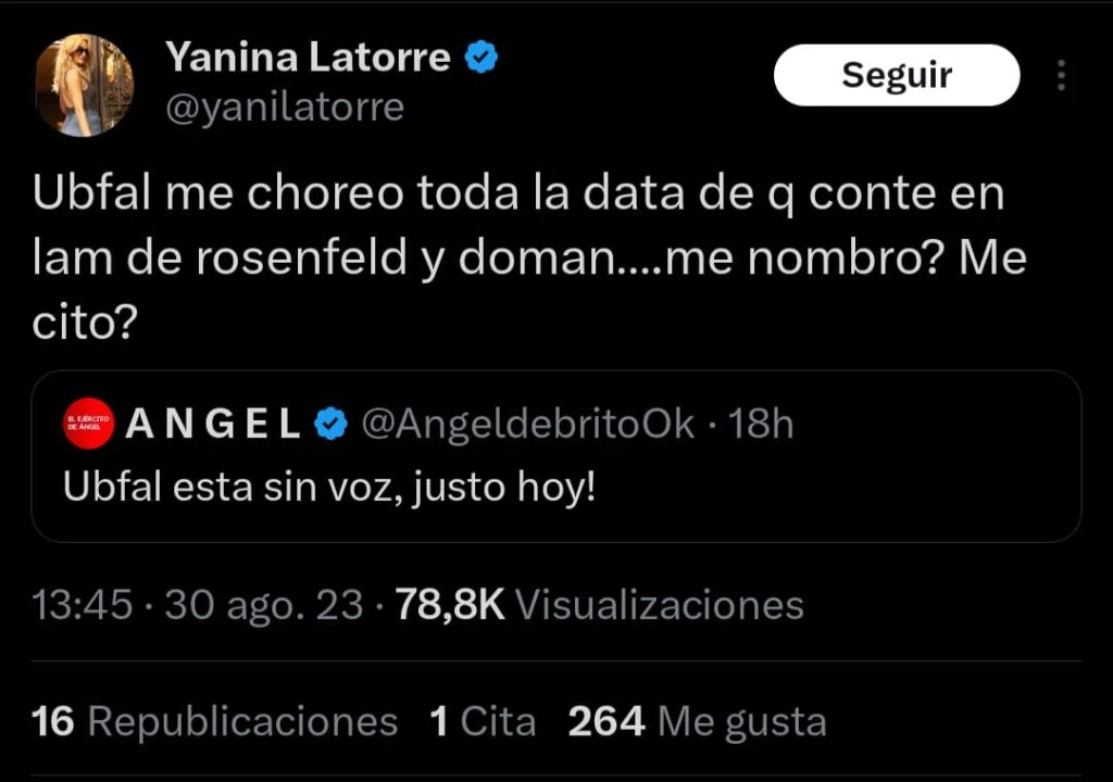 Ante esto Yanina reposteo un Tweet del presentador en que deliró a la periodista de espectáculos y Latorre aprovecho para darle con todo a Laura: "Ubfal me choreo toda la data que conté en lam de Rosenfeld y Doman…¿me nombro? ¿Me cito?" twitteó indignada.