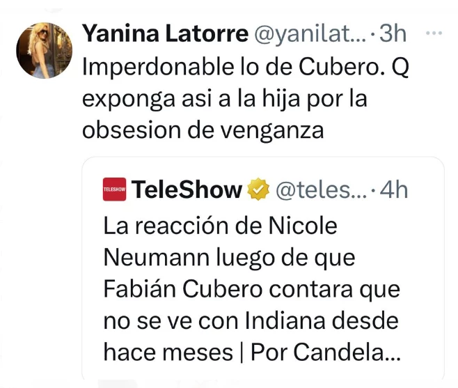 La divulgación de esta privacidad estimuló a Yanina a exclamar su lectura tajante contra Cubero. La angelita se apoyó en un tuit de un medio que refería a la noticia de la confesión de Fabián y armó un mensaje cargado de vehemencia contra la pareja de Mica Viciconte.