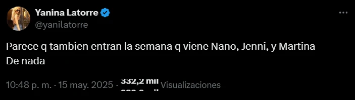"La semana que vienen entran "sin jugar" varios ex a la casa. Tengo dos nombres. (Por eso no entran hoy). No esperen a Chiara y Luciana hoy, entran la semana que viene. Parece que también entran la semana que viene Nano, Jenni y Martina. De nada", escribió.