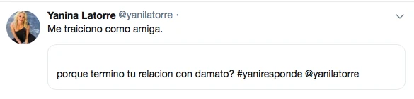 Sin abstenerse de revelar los datos que sabe o de contestar cosas de su ámbito privado, la mediática se atrevió a contestarle a un seguidor que le preguntó “¿por qué terminó tu relación con Débora D’Amato?”. Y punzante, Yanina Latorre disparó: “Me traicionó como amiga”.