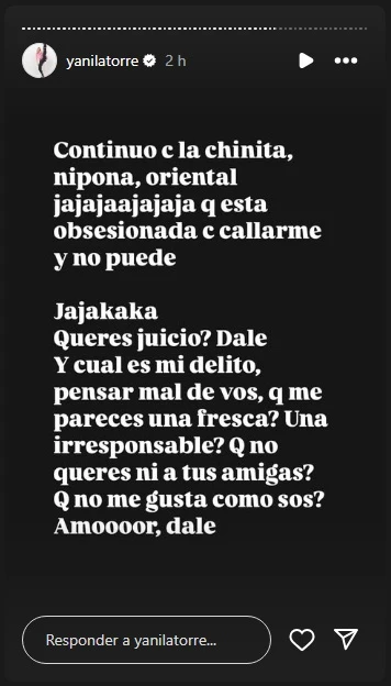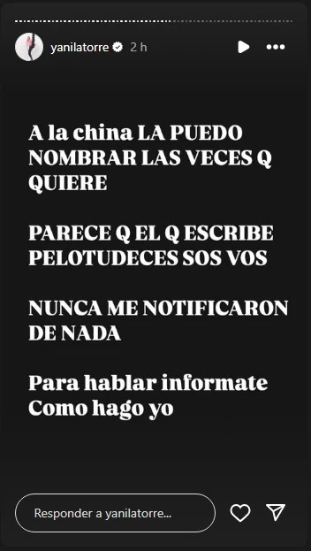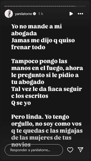 En este punto, la ex Casi Ángeles salió hoy a disparar contra Latorre, con un posteo en sus historias de Instagram donde la acusa de estar obsesionada, de ser una “cornuda” y prometiendo que va a ir hasta las últimas consecuencias en materia legal. Va a buscar hacerle un juicio por todo este tema, culpándola además de diferentes situaciones que sufrió por estas “mentiras” que estaría contando.
