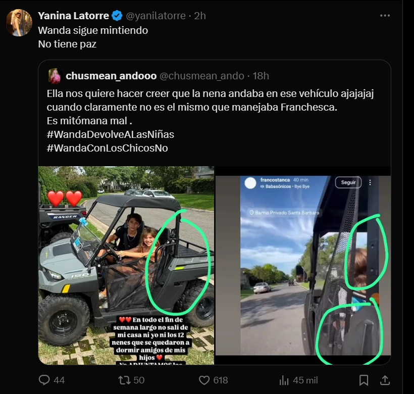 Luego del fin de semana largo del Carnaval, Wanda Nara se vio obligada a hacer un descargo en redes. Todo, porque se viralizó un video de su hija Francesca Icardi conduciendo un buggy a alta velocidad por las calles del barrio privado Santa Bárbara. Pero Yanina Latorre no se la dejó pasar y la deschavó públicamente.