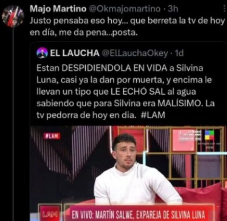 "Están despidiéndola en vida a Silvina Luna, casi ya la dan por muerta, y encima le llevan un tipo que le echó sal al agua sabiendo que para Silvina era malísimo. La tv pedorra de hoy en día", publicó un usuario de redes sociales conocido como El Laucha, quien suele analizar el contenido que se presenta en la tevé.