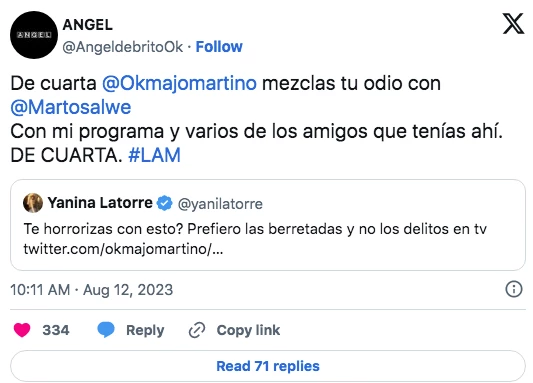 "¿Te horrorizas con esto? Prefiero las berretadas y no los delitos en tv", lanzó Latorre, súper picante en su devolución. Pero eso no fue todo... Yanina, también le hizo un categórico reproche a Majo, basándose en la denuncia que tiene su hermano de Flor Moyano por acoso sexual mientras ambos participaban de El hotel de los famosos 2 . "De cuarta @Okmajomartino mezclas tu odio con @Martosalwe, con mi programa y varios de los amigos que tenías ahí. De cuarta".