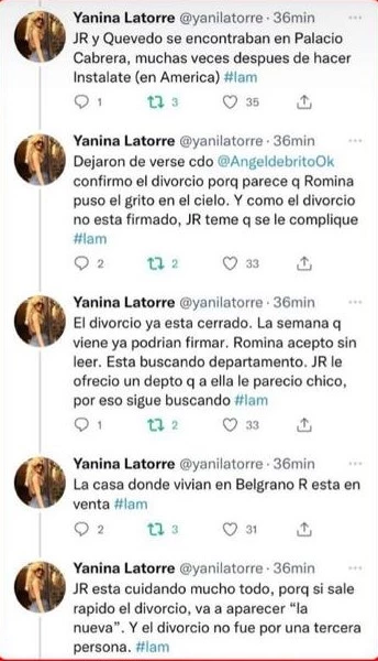 "Dejaron de verse cdo @AngeldebritoOk confirmo el divorcio porq parece q Romina puso el grito en el cielo. Y como el divorcio no esta firmado, JR teme q se le complique. La casa donde vivian en Belgrano R esta en venta", agregó Yanina Latorre.