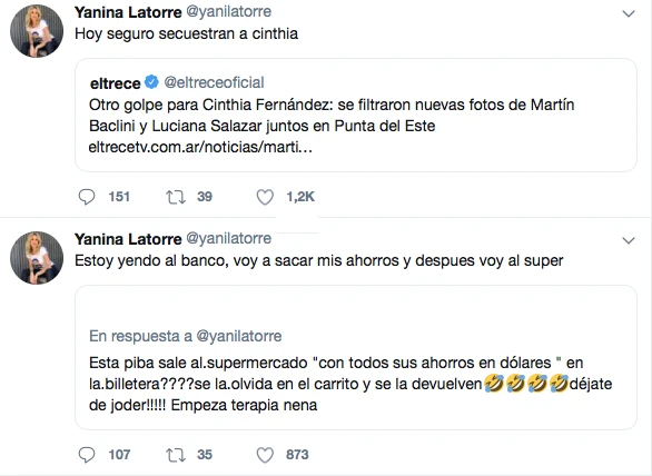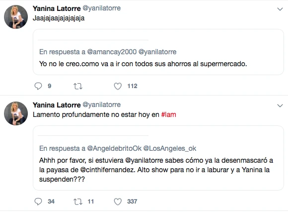 No obstante, quien continúa sin creerle es Yanina Latorre, su compañera de piso en LAM con quien ya tuvo más de un conflicto. Desde su cuenta de Twitter, mientras disfruta de unos días en Punta del Este, la mediática apuntó contra la veracidad de la historia de Cinthia y le contestó a varios usuarios que le preguntaron su opinión.