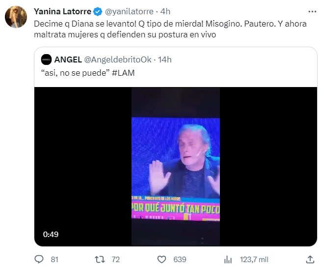 “¡Decime que Diana se levantó! ¡Qué tipo de mierda! Misógino. Pautero. Y ahora maltrata mujeres que defienden su postura en vivo”, expresó la angelita estrella de LAM en Twitter, al compartir el clip.