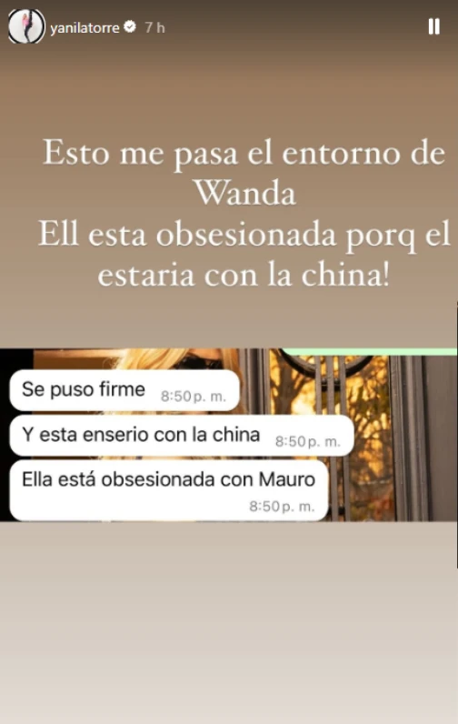 “Esto me pasa el entorno de Wanda. ¡Ella está obsesionada porque él estaría con la China!”, anunció la rubia al publicar en sus historias de IG sus chats con una de las íntimas de la conductora de BakeOff Famosos. “Se puso firme, y él está en serio con la China. Ella está obsesionada con Mauro”, se lee.