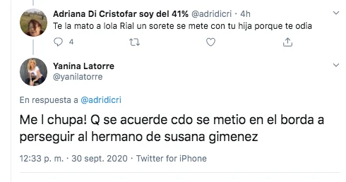 Hace unas horas, una usuaria le escribió en Twitter y le echó nafta al fuego: “Te la mató a Lola Rial un sorete se mete con tu hija porque te odia”. Lejos de tomarse un tiempo para analizar las declaraciones del periodista, la panelista de LAM saltó con todo, fiel a su estilo filoso.