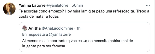 Pero claro, Yanina no se la iba a comer sin decir nada. Y arremetió con todo desde su cuenta de Twitter, donde dispara contra todo el mundo Primero, dijo que la respuesta "le parecía demasiado" y le pidió que "se bajara del pony", pero después se enojó "en serio" y le tiró con todo. Sucedió cuando una internauta le dijo que "ella es educada y no insulta a nadie", y Latorre le respondió "¿No te acordás cómo empezó? Creció a costa de matar a todas". Además, prometió dedicarle un espacio en LAM. ¡Agarrate!