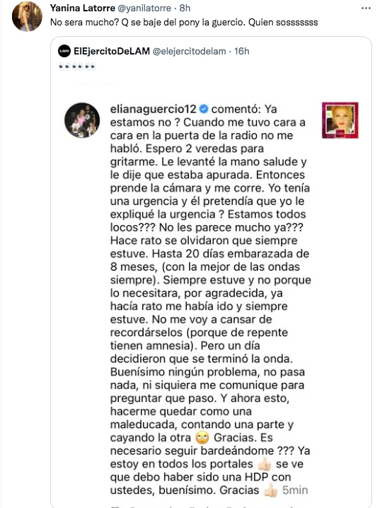 Después, la Guercio aclaró en un largo posteo en Instagram que estaba "en una urgencia" y que por eso no pudo detenerse a responder. Y de alguna manera "acusó" a LAM de haberle declarado la guerra cuando ella "siempre estuvo" cuando el programa la necesitó, incluso cuando estaba embarazada.