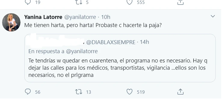 Yanina Latorre estalló esta vez contra seguidores de Twitter que la cuestionaron por seguir trabajando en la cuarentena de coronavirus, sin tomar en cuenta que la trabajadores de prensa están exceptuados de esta veda.