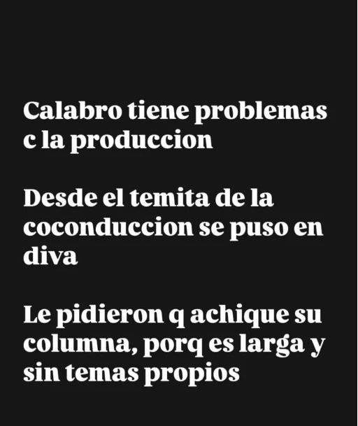En otra storie, la conductora de Sálvese quien pueda exteriorizó la decisión que ejecutaron en el ciclo con Calabró. "Marina tiene problemas con la producción desde el temita de la co-conducción, se puso en diva y le pidieron que achique su columna porque es larga y sin temas propios”.