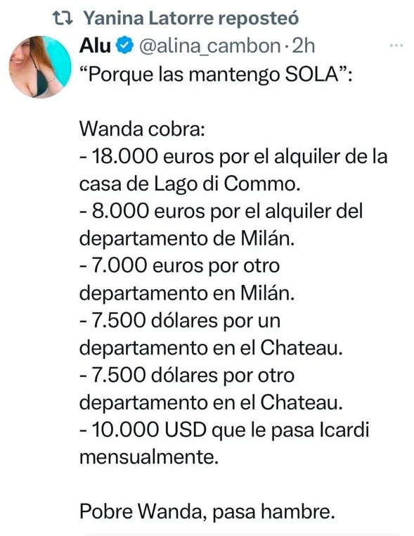 “‘Porque las mantengo SOLA’: Wanda cobra: - 18.000 euros por el alquiler de la casa de Lago di Commo. - 8.000 euros por el alquiler del departamento de Milán. - 7.000 euros por otro departamento en Milán”, comenzaron diciendo.