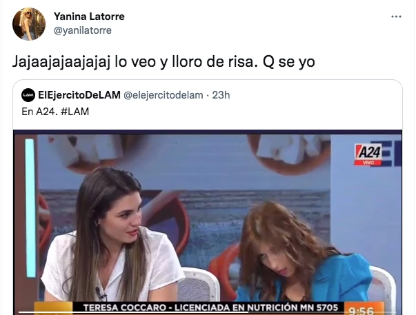 Fue en ese contexto de "humoradas" sobre el acontecimiento que Yanina Latorre contó lo que le había pasado a ella al ver la secuencia. No se sumó a la onda de los memes sino que admitió que le había causado gracia. Después de repostear el video que se viralizó, escribió por encima "Jajaajajaajajaj lo veo y lloro de risa. Q se yo".