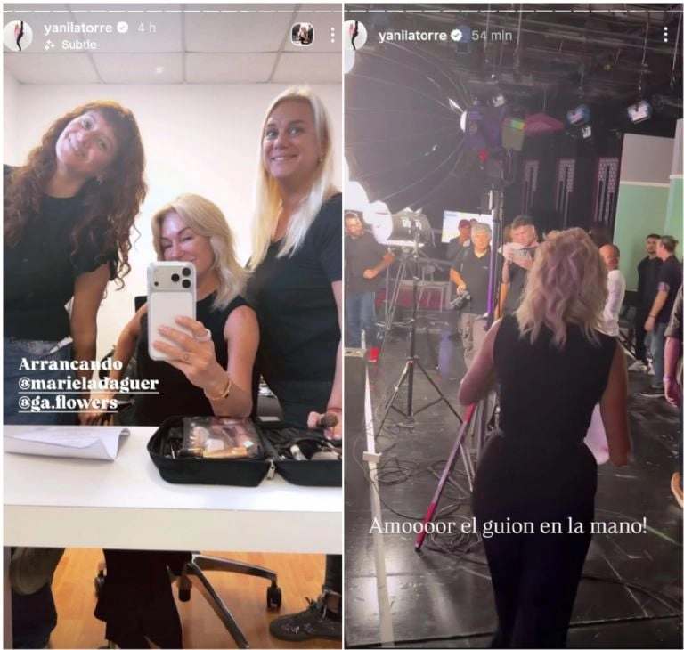 En las imágenes que compartió, se la pudo ver en pleno proceso de producción: maquillaje, peinado y preparación antes de salir a escena. También mostró su llegada al estudio y el saludo al equipo, dejando ver el clima distendido que se vive en el set.