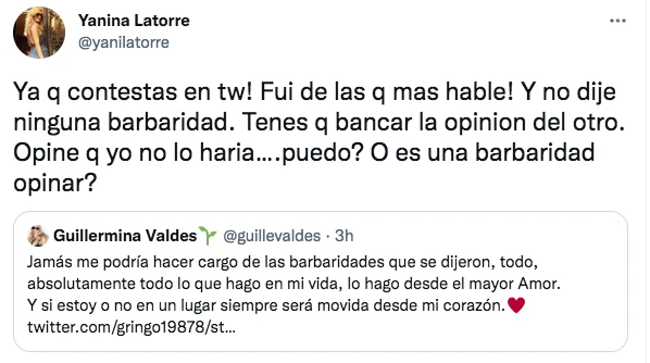 Por supuesto que Yanina Latorre no se quedó en el molde y, fiel a su estilo combativo y contestario, apeló al "golpe por golpe" y respondió por la misma vía digital. "Ya que contestas en Twitter! Fui de las que más hablé! Y no dije ninguna barbaridad! Tenés que bancar la opinión del otro. Opiné que yo no lo haría….¿Puedo? ¿O es una barbaridad opinar?".
