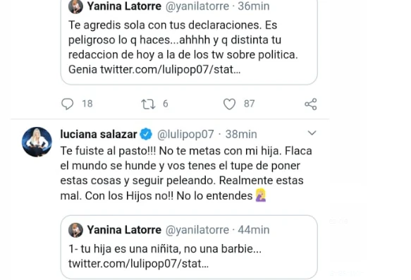 "Te fuiste al pasto!!!! No te metas con mi hija. Flaca el mundo se hunde y tenes el tupé de poner estas cosas y seguir peleando. Realmente estas mal. Con los hijos no!! No lo entendés", así quedó el cruce mediático.