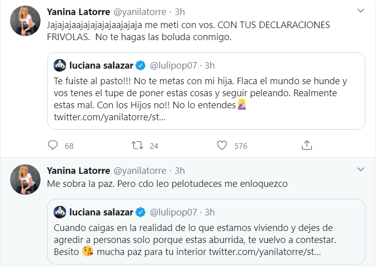 La mala relación entre la periodista Yanina Latorre y la modelo Luciana Salazar y los cruces entre ellas, tuvo un nuevo capítulo. En los tiempos de la cuarentena, esta vez se trenzaron por Twitter.