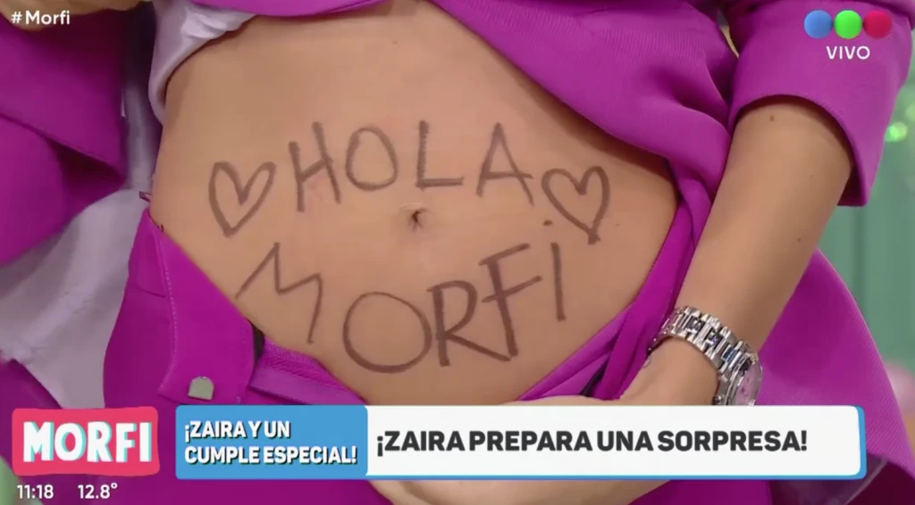 Dando a entender que estaba embarazada, junto a su hija Malaika de tres años que estaba en el piso acompañándola, Zaira confirmó la noticia preguntándole a la pequeña: “¿Querés que les contemos? ¿Qué tiene mami en la panza?”. Dicho esto, se levantó el blazer y mostró en su incipiente pancita que había escrito “Hola Morfi” con marcador.