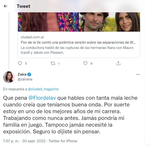 "Por suerte estoy en uno de los mejores años de mi carrera. Trabajando como nunca antes. Jamás pondría mi familia en juego. Tampoco jamás necesité la exposición. Seguro lo dijiste sin pensar", finalizó indignada Zaira Nara en las red social del pajarito.