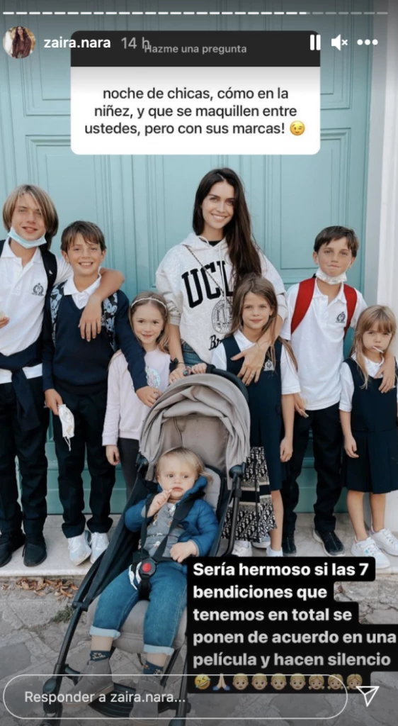 "Sería hermoso si las siete bendiciones que tenemos en total se ponen de acuerdo para ver una película y hacen silencio", contestó, y para ilustrar el dulce montón de “bendis”, compartió una foto de la banda completa a la vuelta del colegio: sus cinco sobrinos y sus dos hijos, Mali y Viggo.