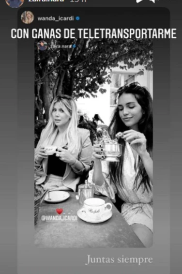Allí, la morocha tomó una foto que subió la rubia hace unas semanas de una tarde de paseo por París donde se las ve tomando el te (“Juntas siempre”, dice Wanda) y le sumó una hermosa frase de apoyo en medio de la crisis de pareja de su hermana: “Con ganas de teletransportarme”, dijo en un texto sentido.